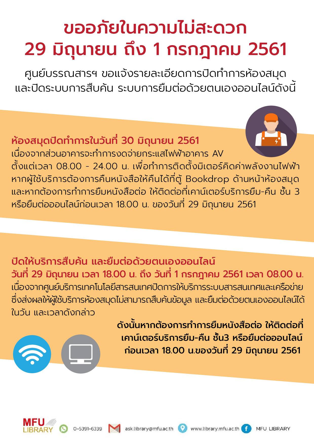 แจ้งปิดทำการห้องสมุดวันที่ 30 มิ.ย. 61 และการปิดบริการออนไลน์ 29 มิ.ย. – 1 ก.ค. 61 . 653 total views, 1 views today