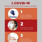 COVID-19 infection control and prevention measures in the library New Library hours: Monday – Friday: 08.00 A.M. – 05.00 P.M. (Closed on weekend/holidays) We have COVID-19 infection control and prevention measures in the library as below. • Limit the number of daily users to 200 according to the amount of seats provided. (Normally, we can accommodate users). • Carry temperature checks on users. Those with body temperature above 37.5°C are prohibited from using the library. • Increase the frequency of cleaning tables, chairs and frequently touched spots. •Accept library fines via QR code payment only. Respectfully, library users are subject to the following requirements: • Enter the library using a gate near “Shong Cafe” only. • Scan the “THAI CHA NA” QR code before entering and leaving the library. • Wear a face mask while in the Library at all time. • Seriously keep physical distance from other individuals. •Frequently wash your hands. Hand sanitizer is provided at the library entrance as well as liquid soap in toilet. Theses rooms are still closed • Group study rooms • Multimedia Rooms • ECO-Corner Room • Quiet Room 1,021 total views