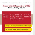 COVID-19 infection control and prevention measures in the library (12-24 December 2020) New Library hours: Monday – Friday: 08.00 A.M. – 10.00 P.M. Saturday – Sunday: 10.00 A.M. – 06.00 P.M. (Closed on holidays) Living & learning zone and M-Learning Space: 08.00 until Midnight 1,197 total views