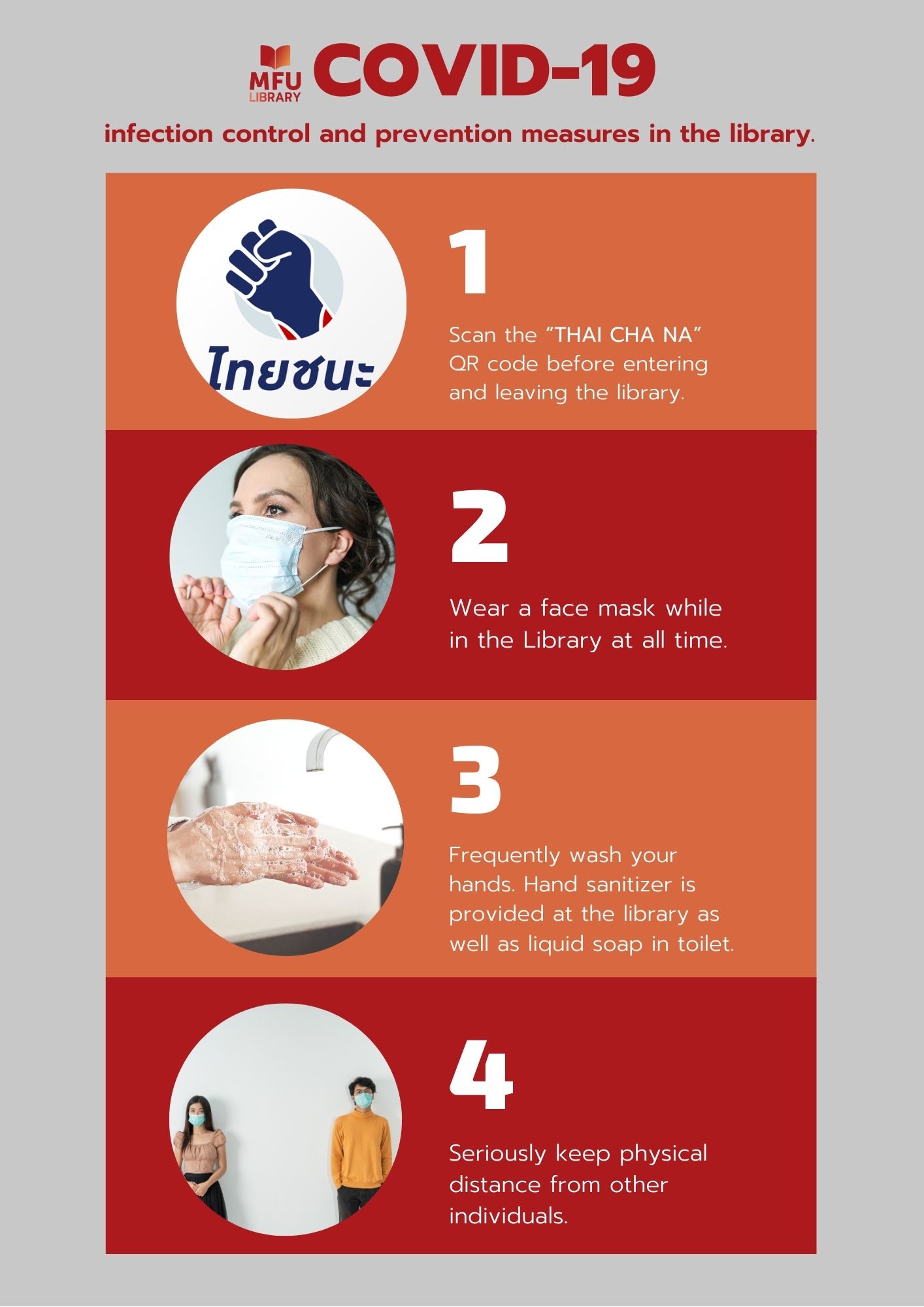• Scan the “THAI CHA NA” QR code before entering and leaving the library.
