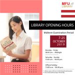 Library opening hours during midterm examination period October 7th-25th, 2019 Monday – Friday 08.00 a.m. – Midnight Saturday – Sunday 10.00 a.m. – 08.00 p.m. Official holiday 10.00 a.m. – 08.00 p.m. *Library opens 24 hours in the living & learning zone. **Free snack and beverage 2 times/day.