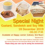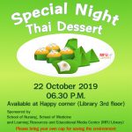 Special night for snack and beverage service at 06.30 p.m. on 22 October 2019. Available at Happy corner (Library 3rd floor). Sponsored by School of Medicine, School of Nursing and Learning Resources and Educational Media Center (MFU Library). Please bring your own cup for saving the environment.