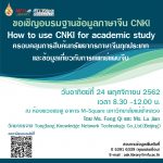 Dear all, MFU Library will organize a “How to use CNKI for academic study” workshop. on 24 November 2019 at M-Square, 5th Floor-Training room 2 in order to researching for chinese resources and chinese medical resources by lecturers from Tongfang Knowledge Network Technology Co., Ltd,(Beijing). If you would like to participate to this event, please register here http://bit.ly/20191124CNKI Thank you Best Regards
