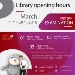 Library opening hours during midterm examination period March 11th-29th, 2019 Monday – Friday 08.00 a.m. – Midnight Saturday – Sunday 10.00 a.m. – 08.00 p.m. Official holiday 10.00 a.m. – 08.00 p.m. *Library opens 24 hours in the living & learning zone. **Free snack and beverage 2 times/day.