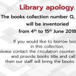 ขออภัยในความไม่สะดวก เนื่องจากห้องสมุดจะทำการสำรวจหนังสือในหมวด Q S และ T ทั้งภาษาไทยและภาษาต่างประเทศ ดังนั้นจึงขอปิดให้บริการในพื้นที่ดังกล่าว ตั้งแต่วันที่ 4 ถึง 15 มิถุนายน 2561 ทั้งนี้หากผู้ใช้บริการต้องการใช้หนังสือในหมวดดังกล่าว สามารถติดต่อได้ที่เคาน์เตอร์บริการยืม-คืน ชั้น 3 โดยแจ้งชื่อหนังสือและเลขเรียกหนังสือ (Call no.) เพื่อให้เจ้าหน้าที่หยิบหนังสือจากชั้นหนังสือมาให้ค่ะ