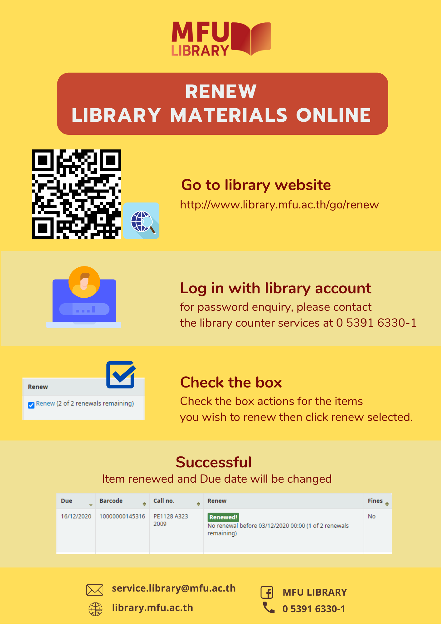 If you would like to renew any of these items, please contact the library staff ordo it yourself through the library website http://www.library.mfu.ac.th/go/renew