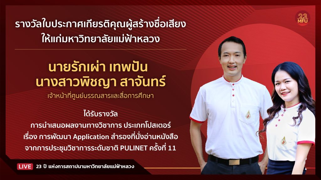 นายรักเผ่า เทพปัน และนางสาวพิชญา สาจันทร์ ได้รับรางวัลใบประกาศเกียรติคุณผู้สร้างชื่อเสียงให้แก่มหาวิทยาลัยแม่ฟ้าหลวง จากการได้รับรางวัลการนำเสนอผลงานวิชาการ ประเภทโปสเตอร์ เรื่อง การพัฒนา Application สำรองที่นั่งอ่านหนังสือ จากการทางวิชาการระดับชาติ PULINET ครั้งที่ 11