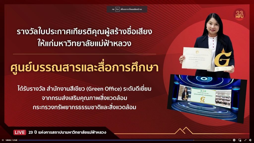 ศูนย์บรรณสารและสื่อการศึกษา มหาวิทยาลัยแม่ฟ้าหลวงได้รับรางวัลใบประกาศเกียรติคุณผู้สร้างชื่อเสียงให้แก้มหาวิทยาลัยแม่ฟ้าหลวง จากการได้รับรางวัล สำนักงานสีเขียว (Green Office) ระดับดีเยี่ยม จากกรมส่งเสริมคุณภาพสิ่งแวดล้อม กระทรวงทรัพยากรธรรมชาติและสิ่งแวดล้อม