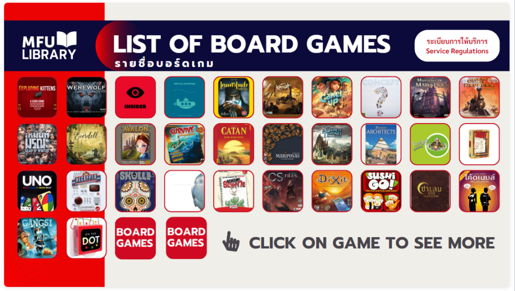 ในปีงบประมาณ พ.ศ. 2566 ศูนย์บรรณสารฯ ได้จัดหาบอร์ดเกมส์เพิ่มเติม จำนวน 16 เกมส์ รวมจำนวนทั้งสิ้น 40 เกมส์ เพื่อเป็นการผ่อนคลายและฝึกสมองให้กับนักศึกษา มีการใช้บริการในปีงบประมาณ พ.ศ. 2566 ทั้งหมดจำนวน 2,726 ครั้ง