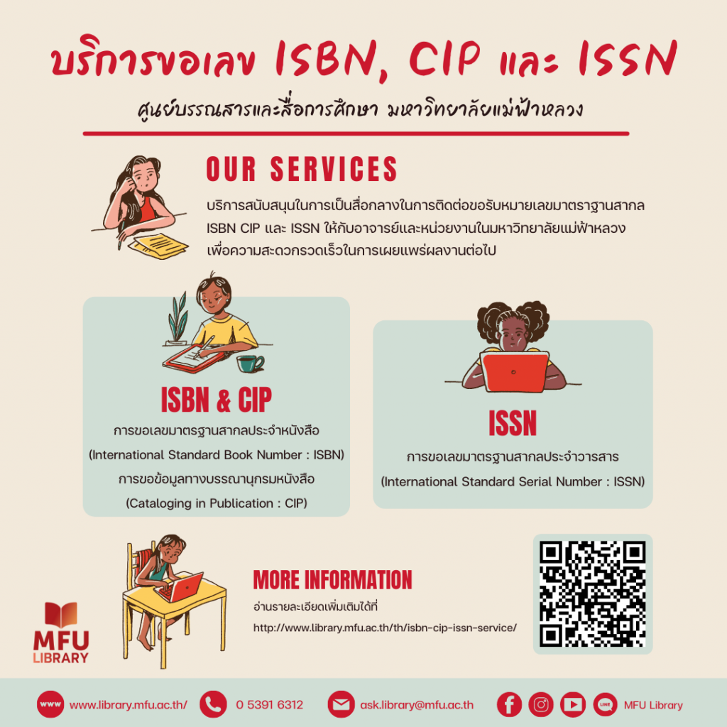 เพื่อช่วยสนับสนุนอาจารย์ หรือหน่วยงานภายในของมหาวิทยาลัยแม่ฟ้าหลวง ในการขอเลขมาตรฐานสากล มีการใช้บริการในปีงบประมาณ พ.ศ. 2566 จำนวน 16 ครั้ง โดยมีความพึงพอใจการให้บริการในระดับมากที่สุด ค่าเฉลี่ย 5.00