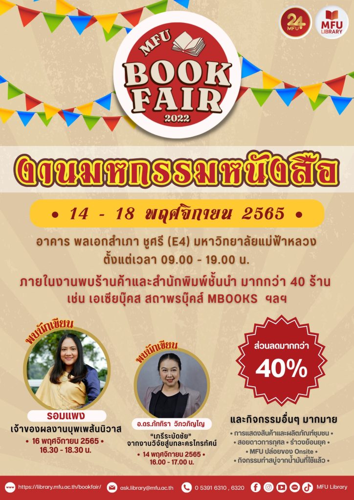 ศูนย์บรรณสารฯ ได้จัดกิจกรรมโครงการมหกรรมหนังสือ (MFU Book Fair 2022) ระหว่างวันที่ 14-18 พฤศจิกายน 2565 ณ อาคารพลเอกสำเภา ชูศรี (E4) โดยมีร้านค้าที่เข้าร่วม 23 ร้านค้า 32 บูธ และร้านค้าเข้าร่วมแบบออนไลน์ 15 ร้านค้า มีรายได้จากการเช่าบูธจัดงานจำนวน 126,000 บาท ได้รับงบประมาณดำเนินโครงการจำนวน 82,300 บาท และมีผลค่าใช้จ่ายในการดำเนินงานจำนวน 67,577.80 บาท นอกจากนี้ยังจัดกิจกรรมพิเศษต่าง ๆ เพื่อกระตุ้นการเข้าร่วมกิจกรรม เช่น กิจกรรมการเสวนานักพูด นักเขียนชื่อดัง “รอมแพง” มาพูดคุยแลกเปลี่ยนในผลงานดังเรื่อง บุพเพสันนิเวส และกิจกรรม DIY รักษ์โลก ได้แก่ ตลาดนัดขยะรีไซเคิล การทำสบู่จากน้ำมันใช้แล้ว และกิจกรรม MFU ปล่อยของ ตลอดจนกิจกรรม Smart Reader การมอบของรางวัลให้แก่ผู้ใช้บริการมีการสถิติการยืมทรัพยากรสารสนเทศมากที่สุดในรอบปี พร้อมทั้งกิจกรรมแสดงและจำหน่ายสินค้าจากวิสาหกิจชุมชน โดยมีจำนวนผู้มาร่วมงานจำนวน 10,584 คน (นับสถิติจากตัวกดนับจำนวน) คิดเป็นร้อยละ 264.60 จากเป้าหมายที่กำหนดไว้ 4,000 คน