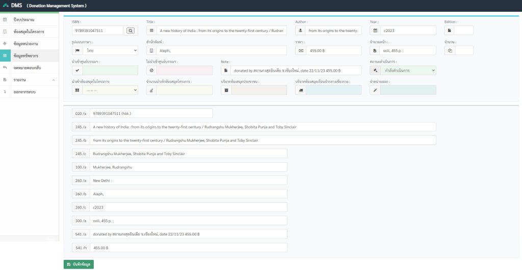ศูนย์บรรณสารฯ ได้พัฒนาระบบการเชื่อมโยงรายการหนังสือจากระบบห้องสมุด Matrix สู่ระบบหนังสือบริจาค เพื่อจัดเก็บข้อมูลหนังสือที่มีการบริจาคให้ศูนย์บรรณสารฯ รวมไปถึงชื่อผู้บริจาค และการตอบกลับจดหมายขอบคุณ