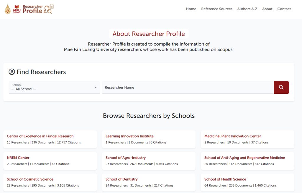 ศูนย์บรรณสารฯ ได้พัฒนาระบบ MFU Researcher profile เพื่อรวบรวมรายชื่ออาจารย์/ นักวิจัยของมหาวิทยาลัยแม่ฟ้าหลวงที่มีบทความตีพิมพ์ในวารสารที่มีอยู่ในฐานข้อมูล Scopus จำแนกตามสำนักวิชาและหน่วยงาน โดยเชื่อมโยงข้อมูลด้วย API ของ Scopus ไปยัง Scopus Author ID เพื่อให้ข้อมูลมีการอัปเดตอัตโนมัติ หากอาจารย์และนักวิจัยมีบทความตีพิมพ์ใหม่ รวมถึงเป็นข้อมูลเพื่อศึกษาการใช้วารสารที่อาจารย์/ นักวิจัยใช้อ้างอิงในการเขียนบทความ