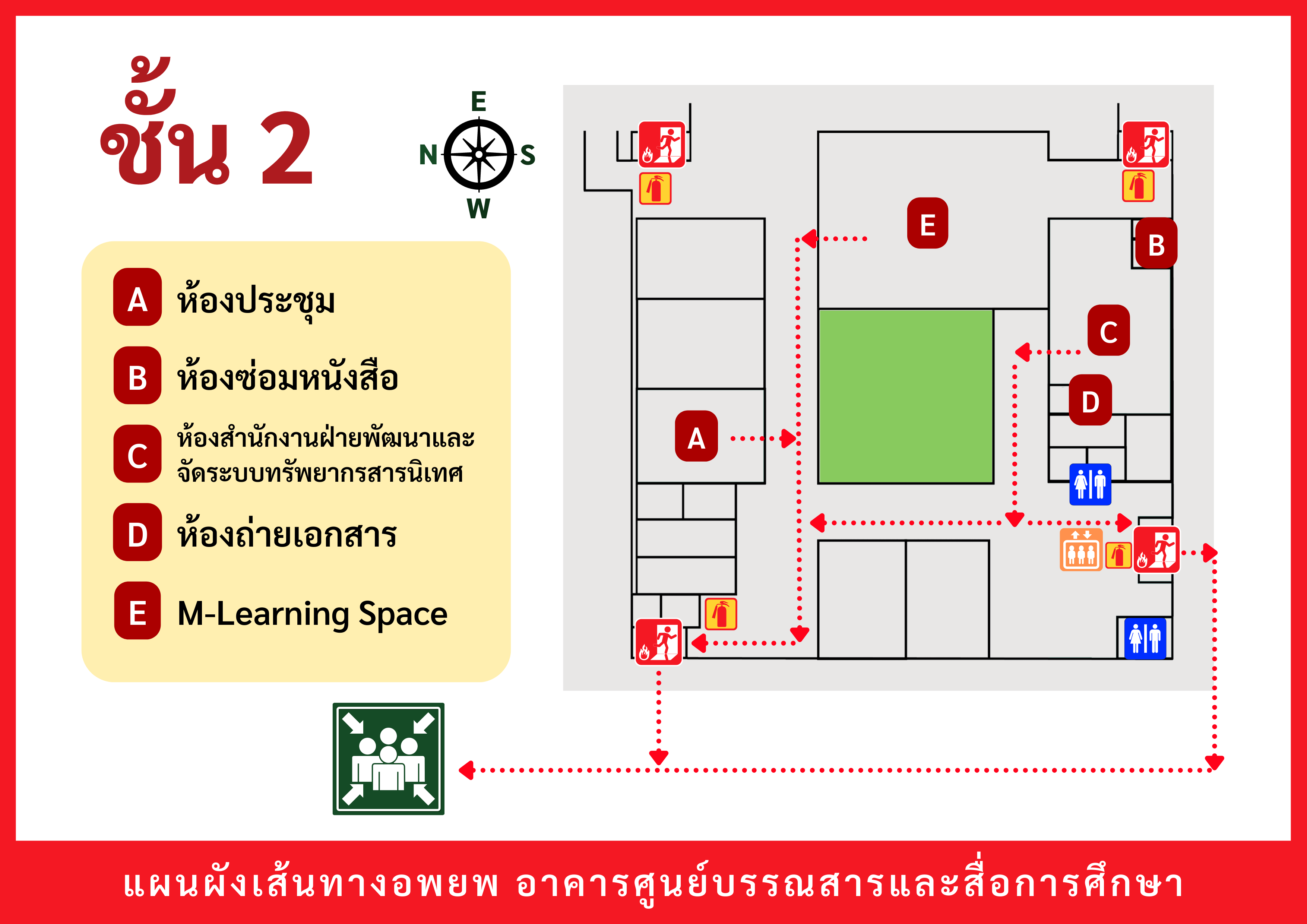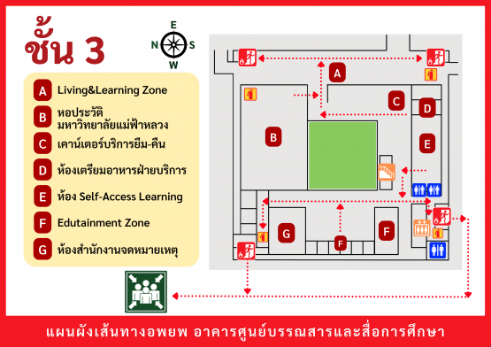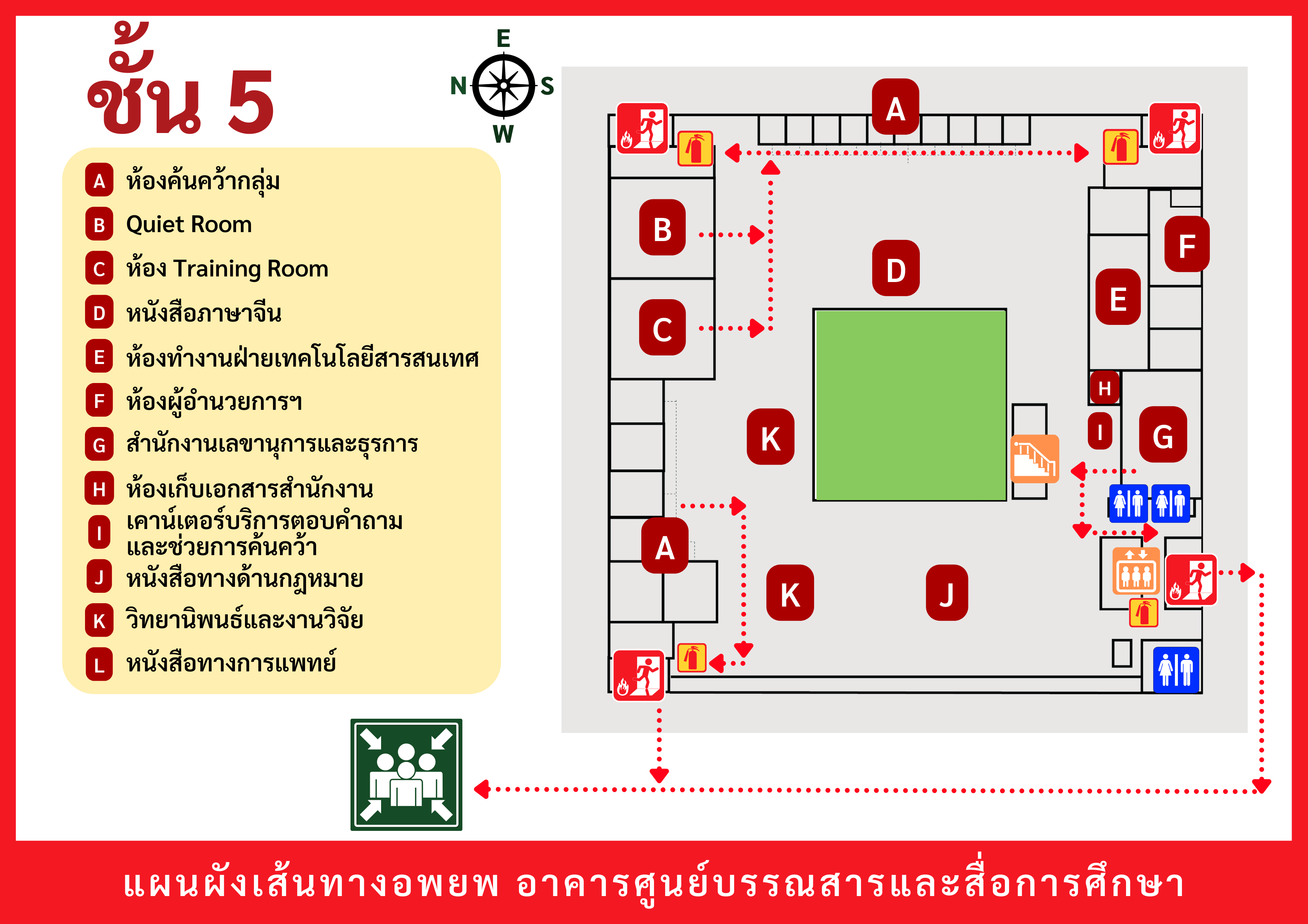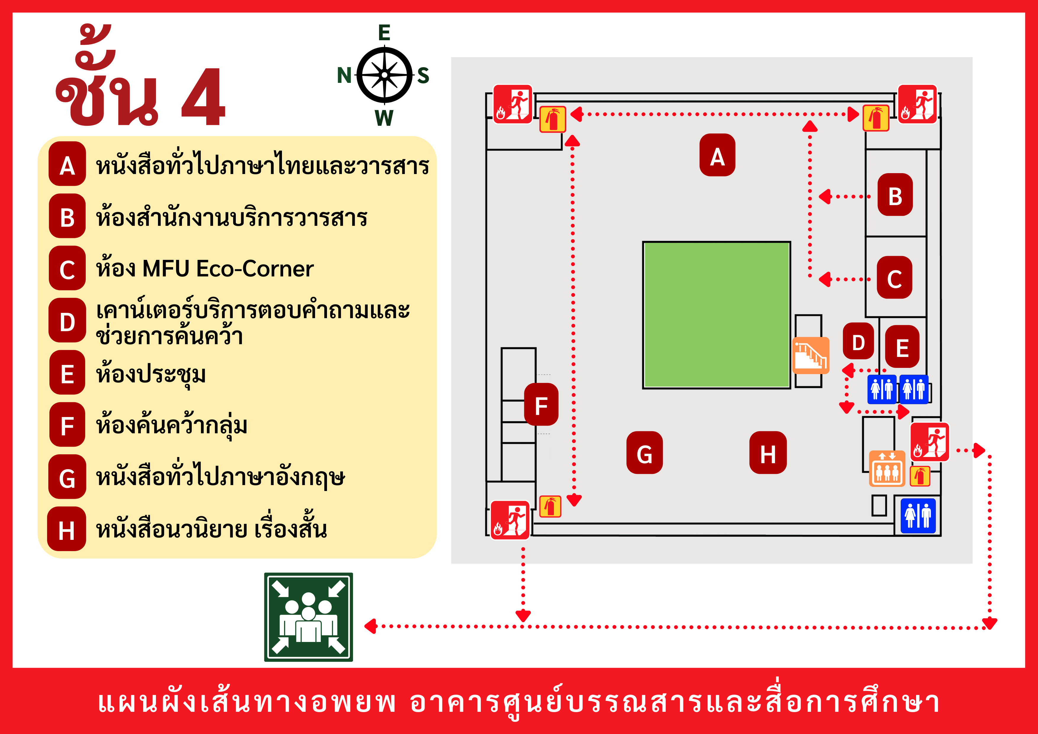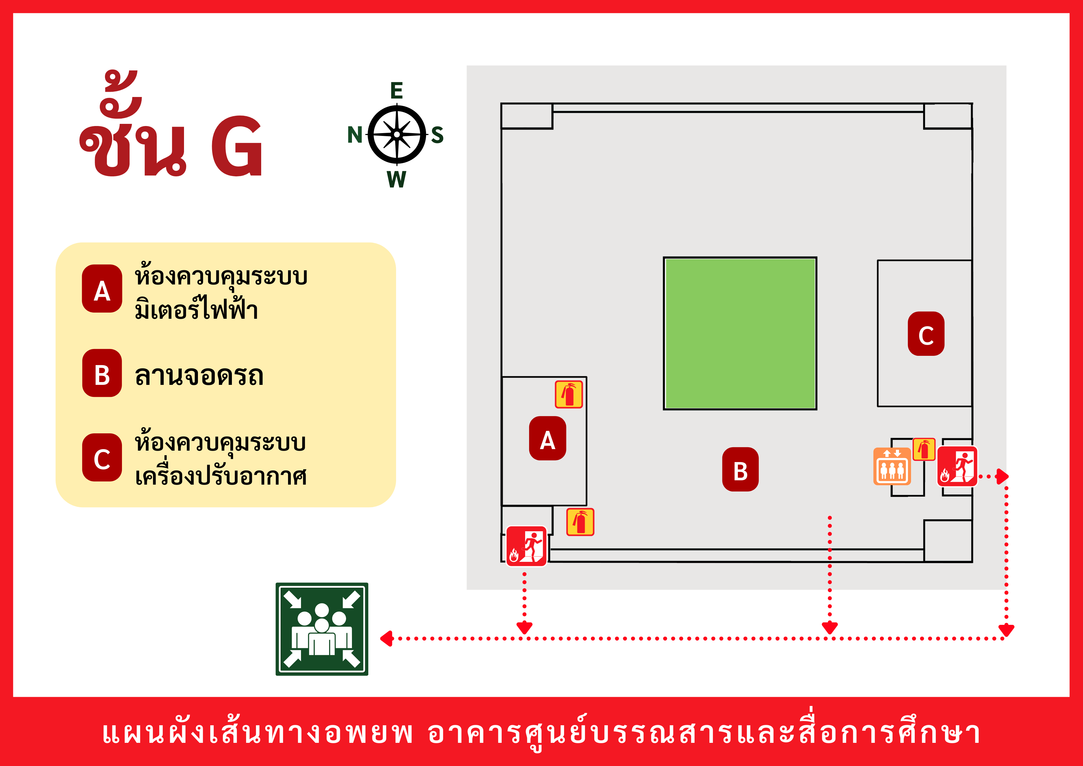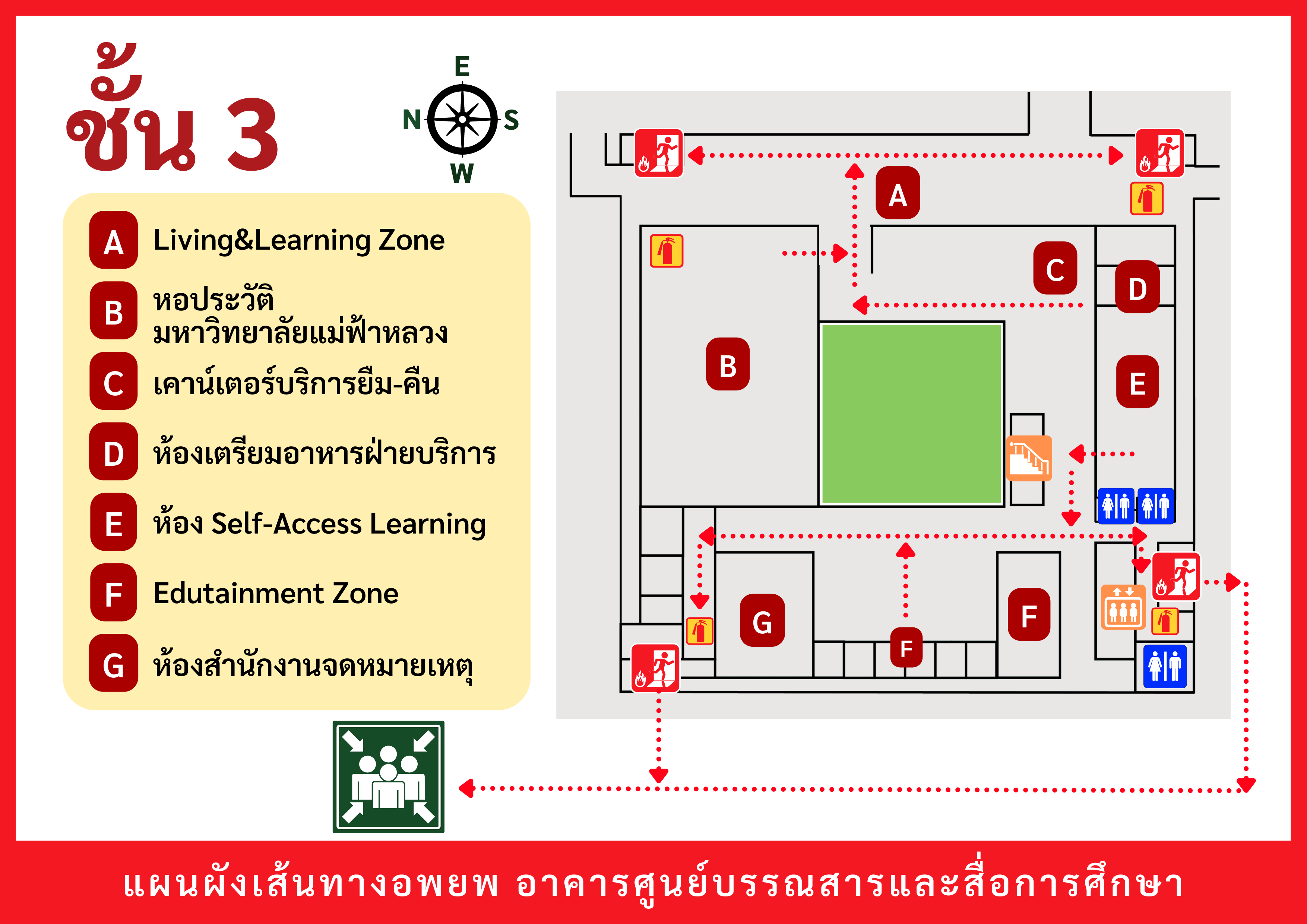 เมื่อเกิดเหตุฉุกเฉินต่าง ๆ (เช่น ไฟไหม้ แผ่นดินไหว ฯลฯ) ให้ผู้ใช้บริการอพยพตามเส้นทาง ดังต่อไปนี้